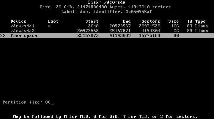 Définissez la taille de cette partition, ici comme prévu 10GB